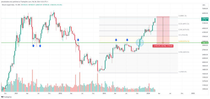 Als we een potentiële correctie van de BTC koers op de huidige grafiek zouden leggen, dan verschijnen er interessante technische correlaties. Een daling van de Bitcoin met 47% vanaf de huidige $59.000 zou leiden tot steun in de buurt van $32.000 (groene lijn).