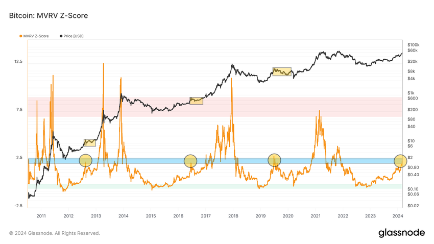 In de grafiek hieronder zien we dat de MVRV Z-Score momenteel gebied 2 (blauw) is binnengegaan. Dit gebeurt voor het eerst in deze cyclus. Bovendien werd in alle vorige cycli het eerste bereiken van dit gebied (gele cirkels) geassocieerd met een op handen zijnde correctie van de BTC koers (gele rechthoeken).