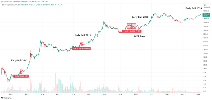 Het blijkt dat de correctie elke keer vrij diep was: 50% in 2012, 38% in 2016 en 53% in 2020. In de drie voorgaande cycli was het gemiddelde dus 47%.