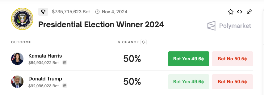 Volgens het voorspellingsplatform Polymarket zijn de kansen dat Trump de verkiezingen wint echter nog steeds 50%.