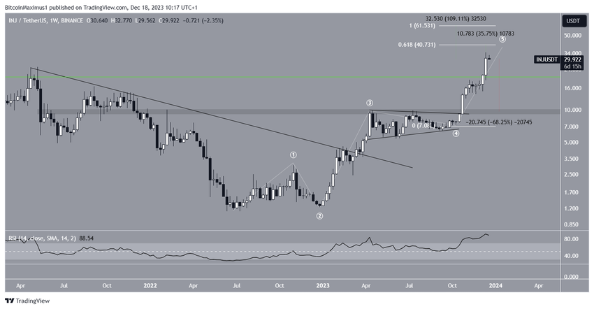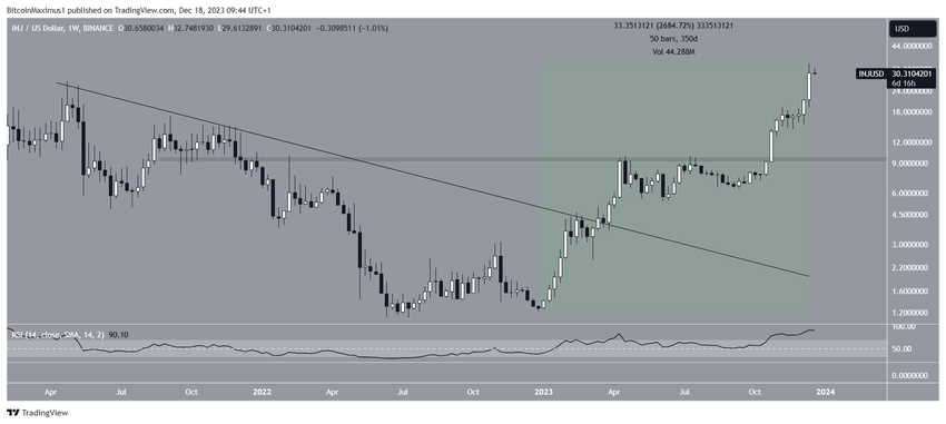 De technische analyse van het wekelijkse tijdframe laat zien dat de INJ koers sinds het begin van het jaar snel is gestegen. De stijging van de INJ koers resulteerde vorige week in een nieuwe all-time high van $34,60. Dit was een opwaartse beweging van bijna 2.700% in 2023.