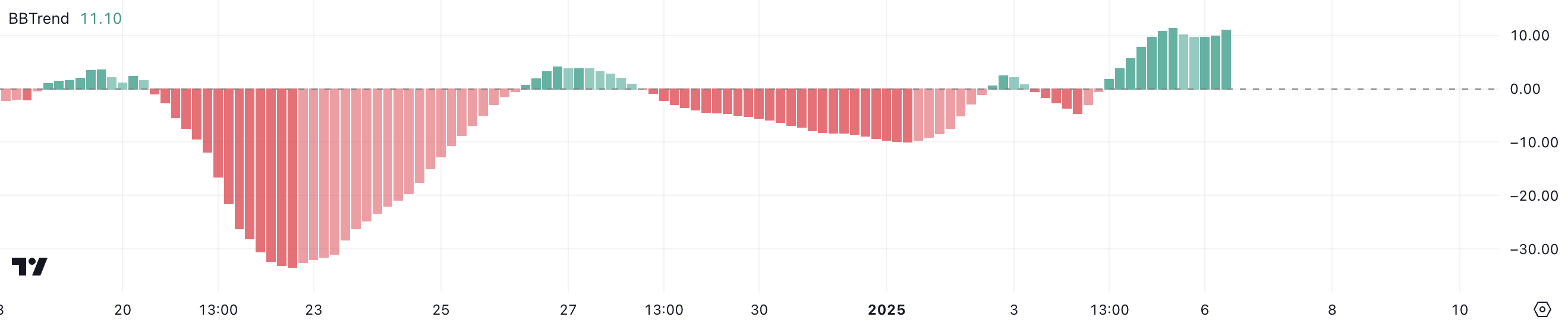 BBTrend, afgeleid van Bollinger Bands, meet de sterkte en richting van een koers trend. Positieve waarden duiden op opwaarts momentum, en negatieve waarden suggereren bearish omstandigheden.