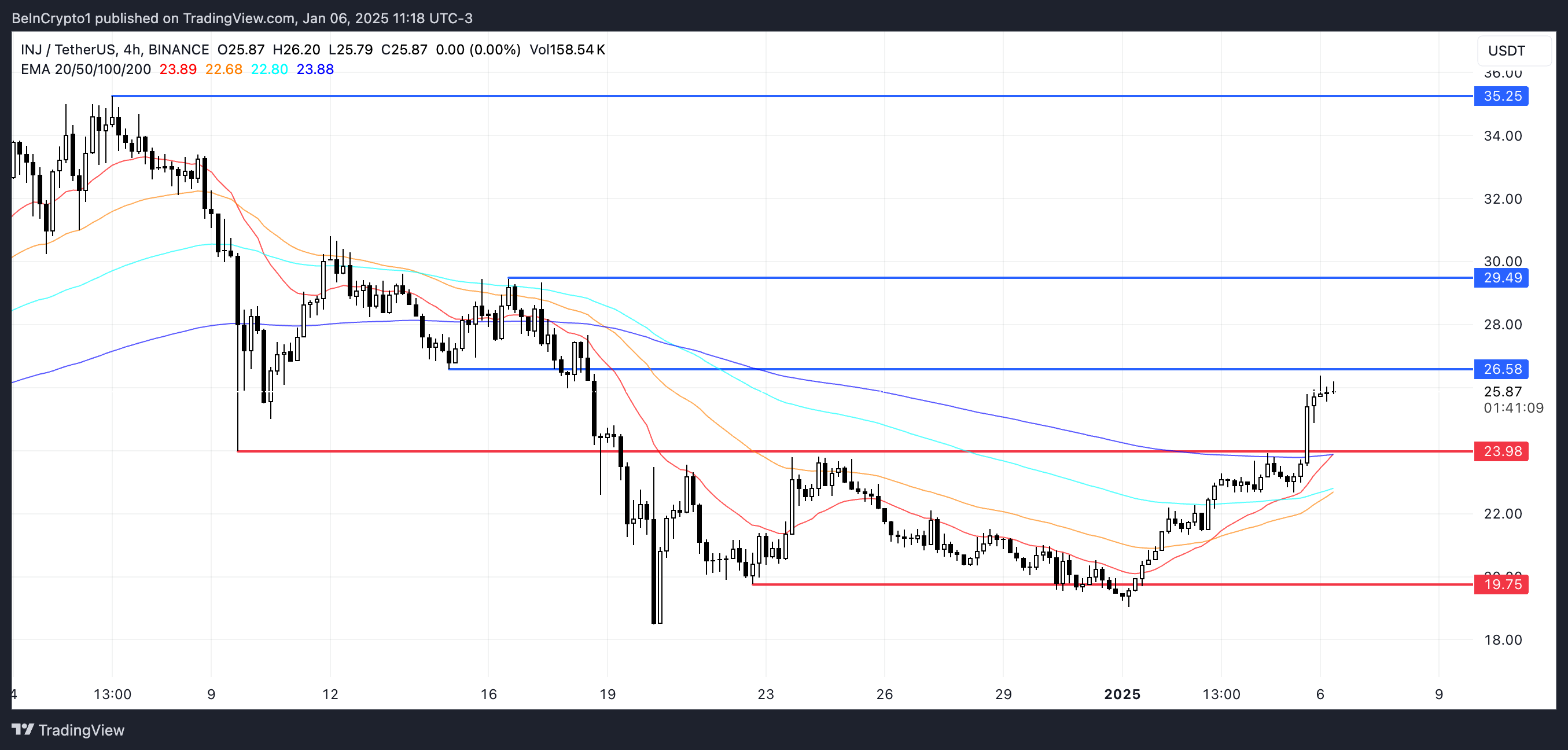 Omgekeerd, als de trend omkeert en de golden cross niet tot stand komt, kan de INJ koers neerwaartse druk ondervinden. De eerste kritieke steun ligt op $23,98, en een doorbraak onder dit niveau kan leiden tot verdere dalingen. In een meer bearish scenario kan de koers dalen naar $19,7.