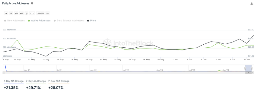 Ondanks een paar kleine dalingen, zoals de daling van 2,68% op 5 juni en de daling van 1,60% op 9 juni. De algemene tendens bleef stijgen. Op 12 juni stegen de dagelijkse actieve adressen tot 1.310, wat de veerkracht van het netwerk en het sterke bullish sentiment rond INJ onderstreept.