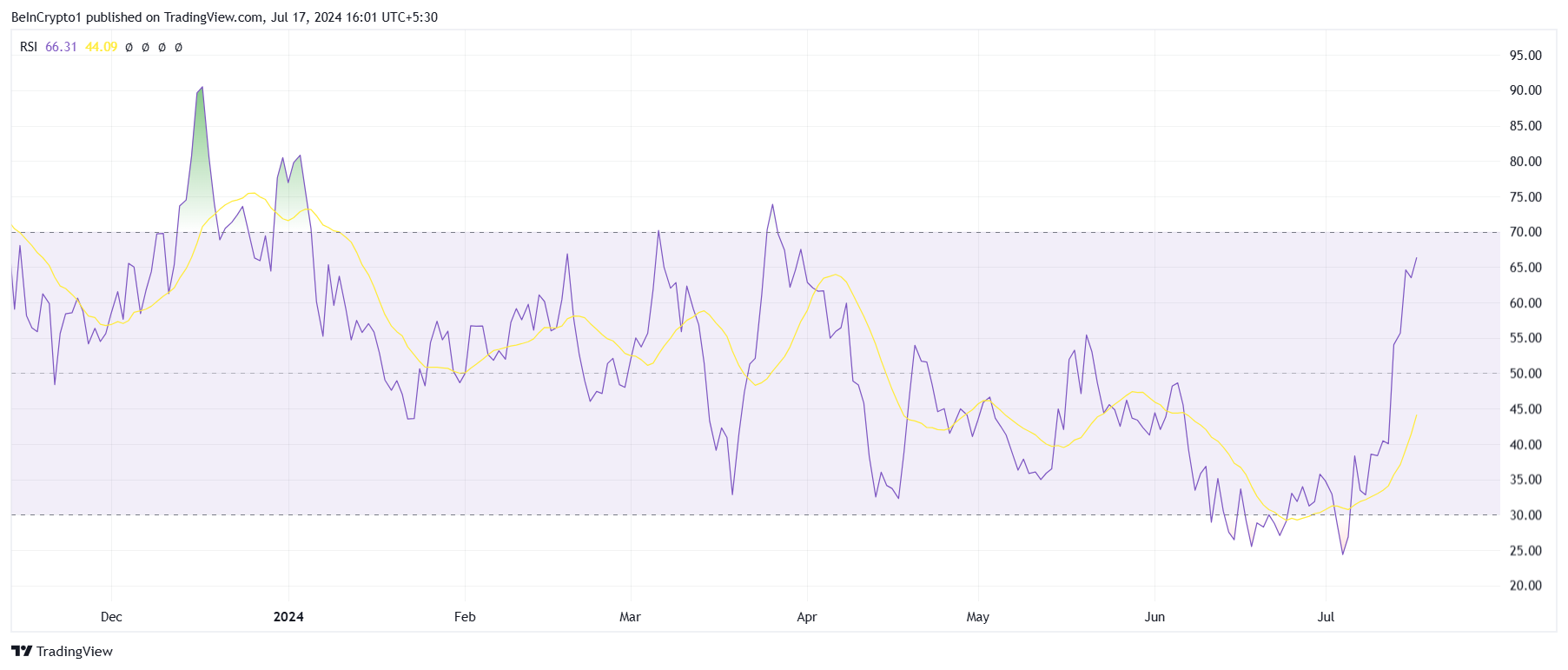 Wanneer de RSI van een coin dit hoge niveau nadert, suggereert dit dat de coin overbought is en in de nabije toekomst een neerwaartse koersaanpassing zou kunnen meemaken.