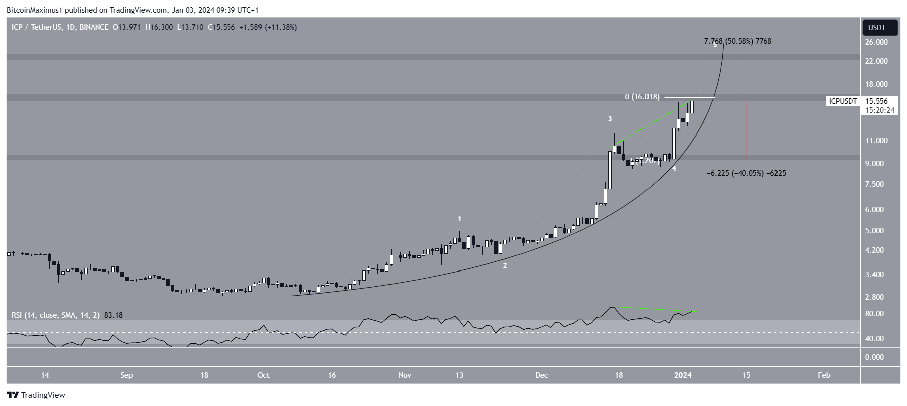 De technische analyse van het dagelijkse tijdframe laat zien dat de ICP koersstijging sinds oktober volledig parabolisch is geweest. De golftelling suggereert dat de koers zich in de vijfde en laatste golf (wit) van deze parabolische stijging bevindt.