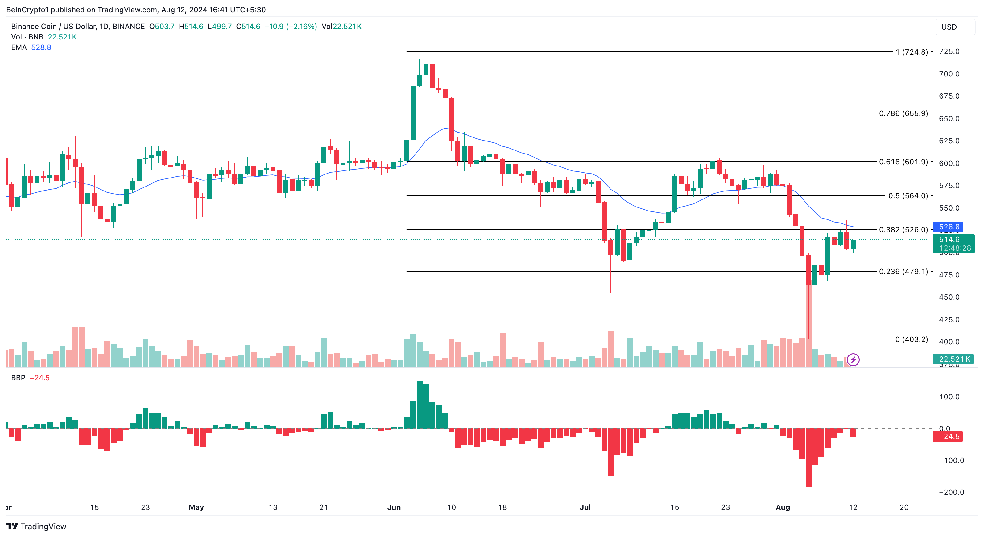 Dit sentiment contrasteert sterk met het optimisme dat werd gezien toen BNB $701 bereikte in juni. Momenteel handelt de altcoin op $508, wat een daling van 5,06% markeert van zijn recente piek van $535 op 11 augustus.