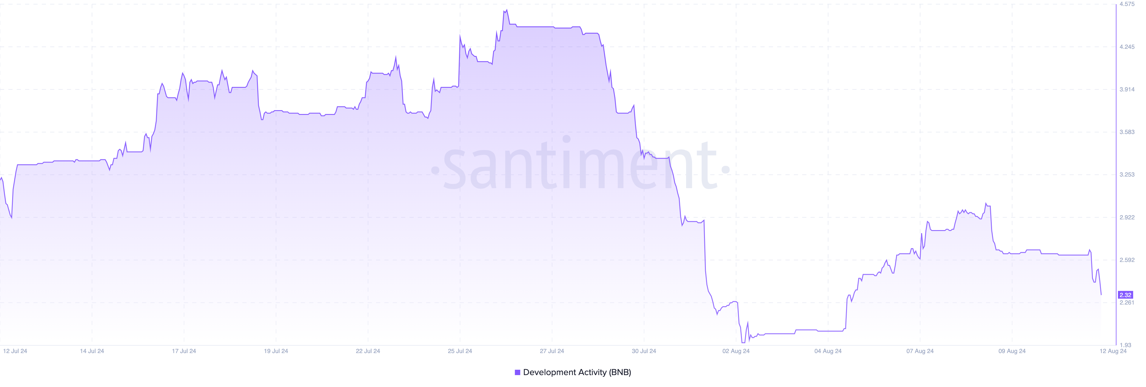 Naast de koersdaling ervaart het BNB-ecosysteem een significante afname in ontwikkelingsactiviteit, een belangrijke metriek voor het beoordelen van de gezondheid en waardering van een blockchain.