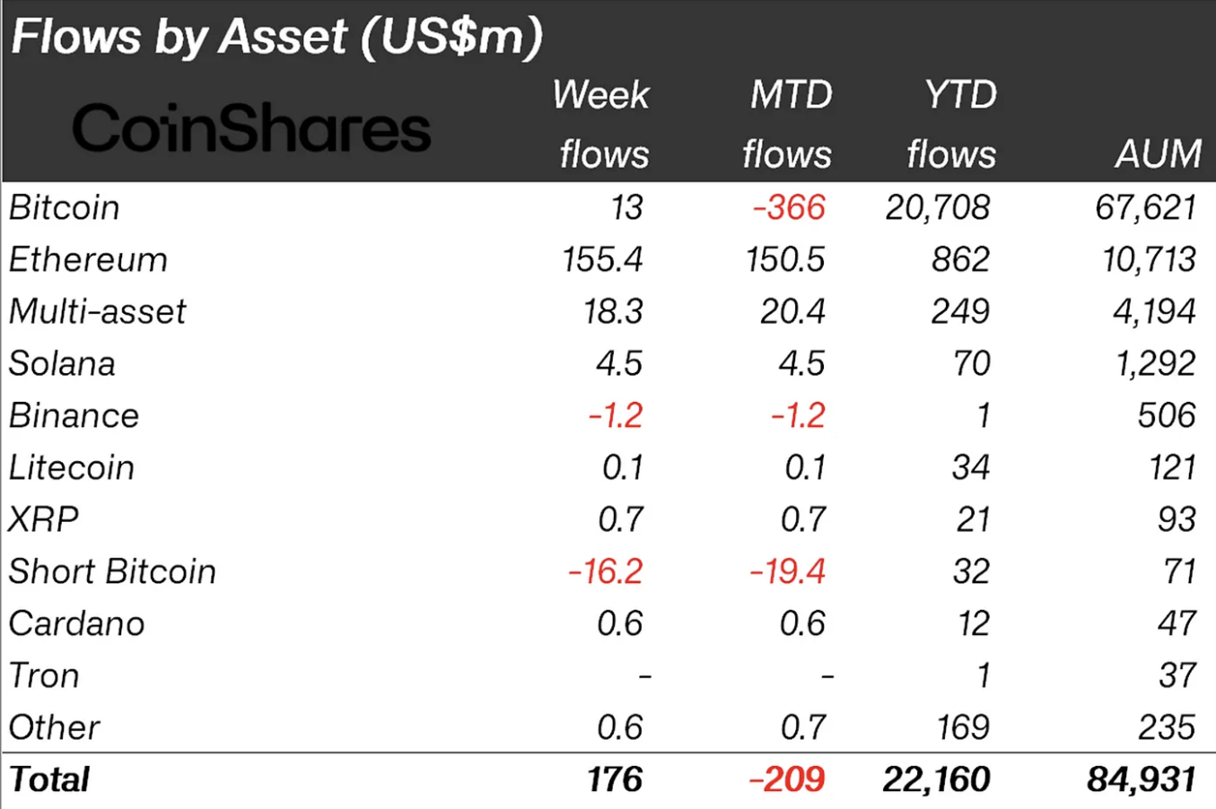 Volgens het laatste rapport van CoinShares zagen digitale activa investeringsproducten instromen ter waarde van $176 miljoen. Deze toename suggereert dat investeerders de crash van afgelopen maandag zagen als een kans om tegen gereduceerde prijzen te accumuleren.