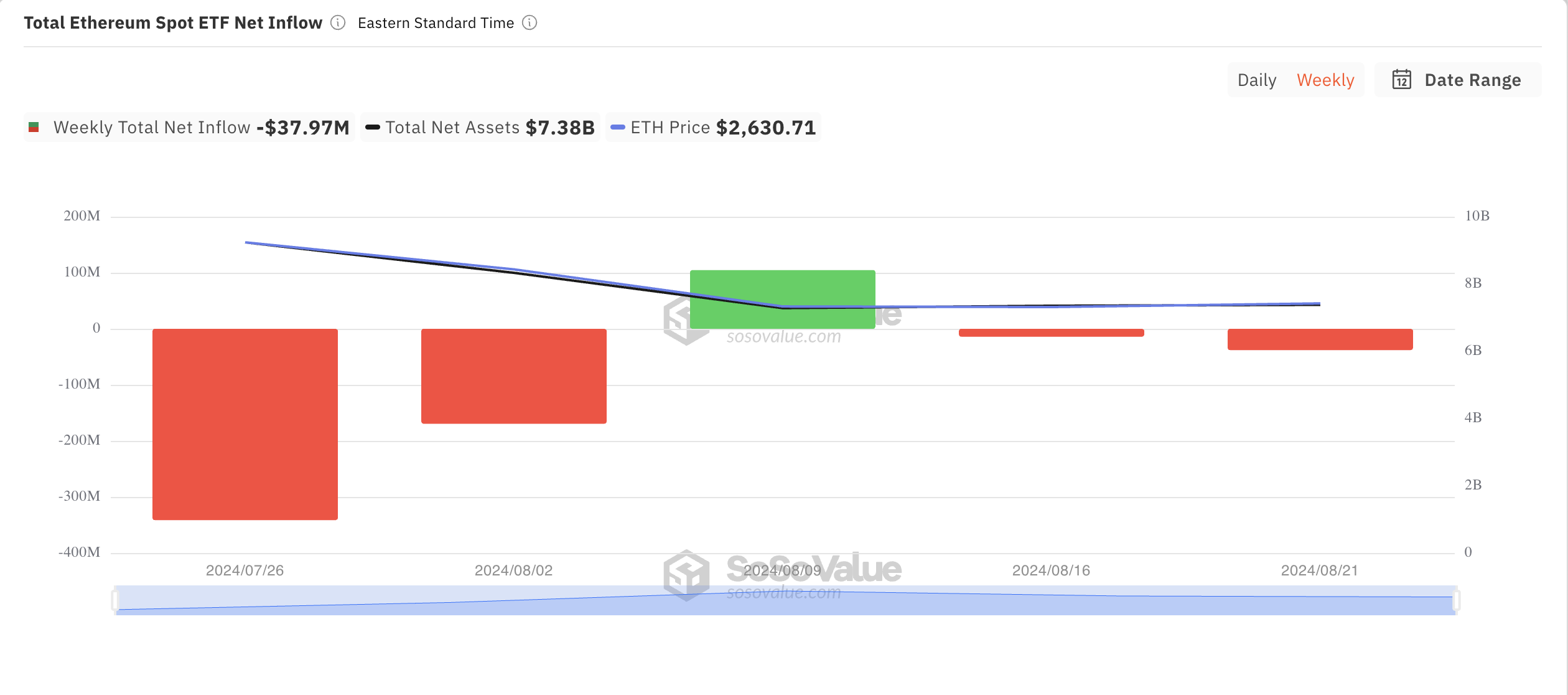 De uitstroom bedraagt tot nu toe deze week $38 miljoen, met totale netto activa van $7,38 miljard. Dit vertegenwoordigt 2,3% van de marktkapitalisatie van ETH.