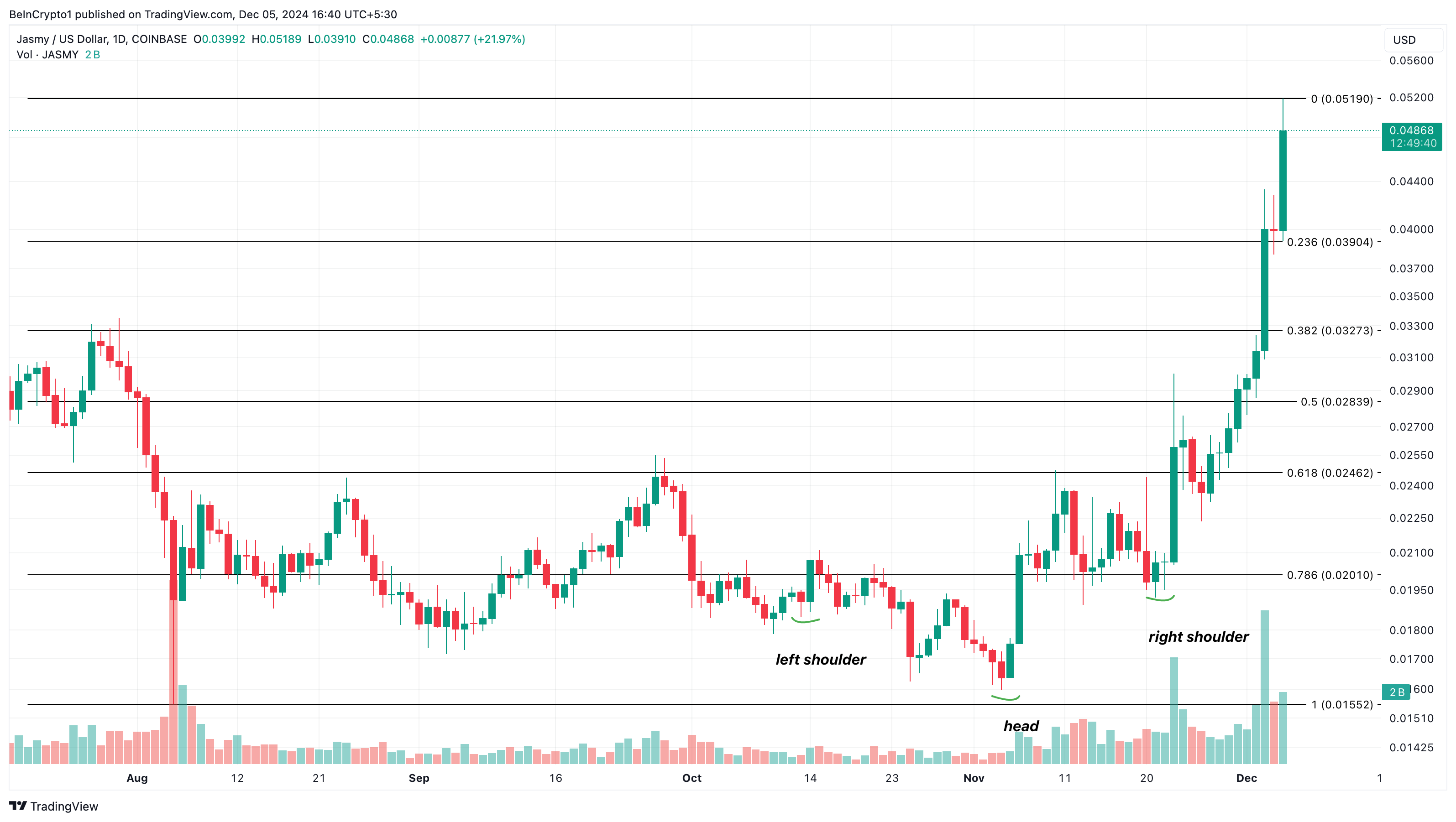 Op basis van de dagelijkse grafiek is JASMY’s positie als best presterende altcoin het resultaat van een inverse head-and-shoulders patroon. Dit patroon, dat van bearish naar bullish beweegt, ontstaat wanneer kopers profiteren van de vermoeidheid van verkopers en de koers hoger stuwen.