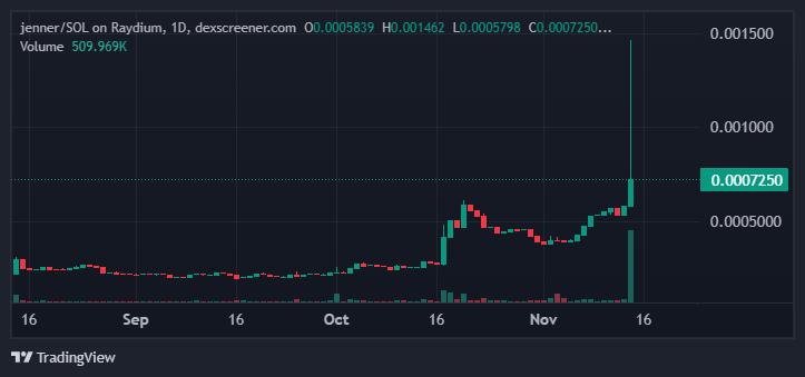 Ondanks dit verslag toont data op DexScreener aan dat de JENNER meme coin sinds de openingssessie van donderdag met 90% is gestegen. Op het moment van schrijven wordt het verhandeld voor $0,0007250.