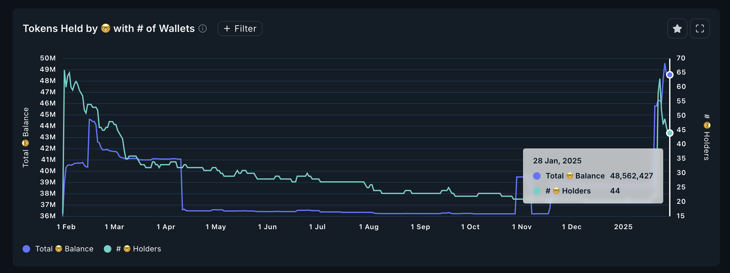 Het aantal smart wallets dat JUP bezit, zag een scherpe stijging, van 22 op 18 januari naar 63 op 23 januari, voordat het daalde naar 44.
