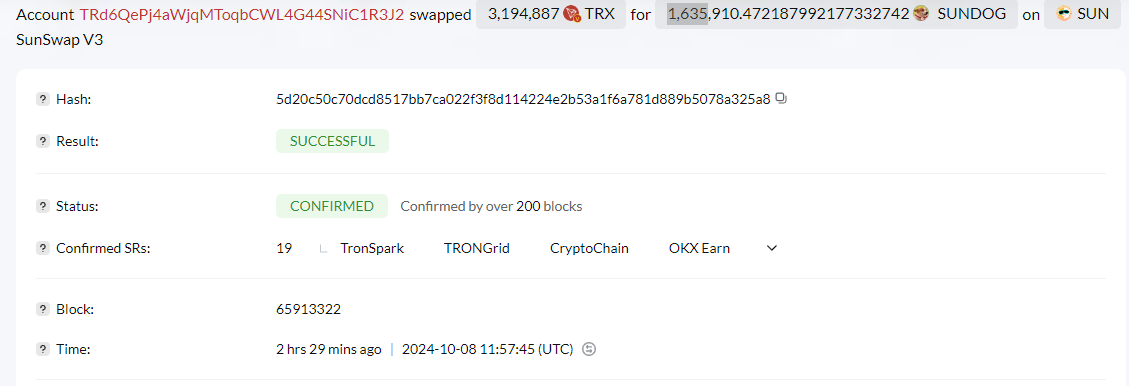 Ty Dolla Sign gebruikte vervolgens de TRX tokens om opnieuw te investeren in SUNDOG meme coin. Volgens gegevens van Tronscan ruilde de artiest 3.194.887 TRX tokens in voor 1.635 SUNDOG coins op SunSwap V3, waardoor de fondsen effectief terugvloeiden naar de meme coin-markt.