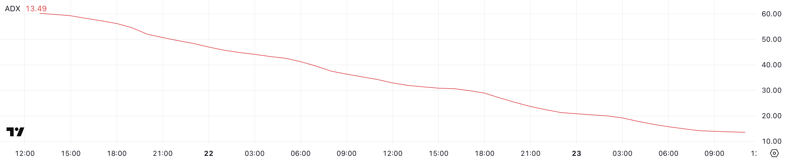 ADX meet de sterkte van een trend ongeacht de richting, en een daling van deze omvang wijst op verzwakkend momentum en een mogelijke verschuiving naar een neutrale of ongedefinieerde trend.