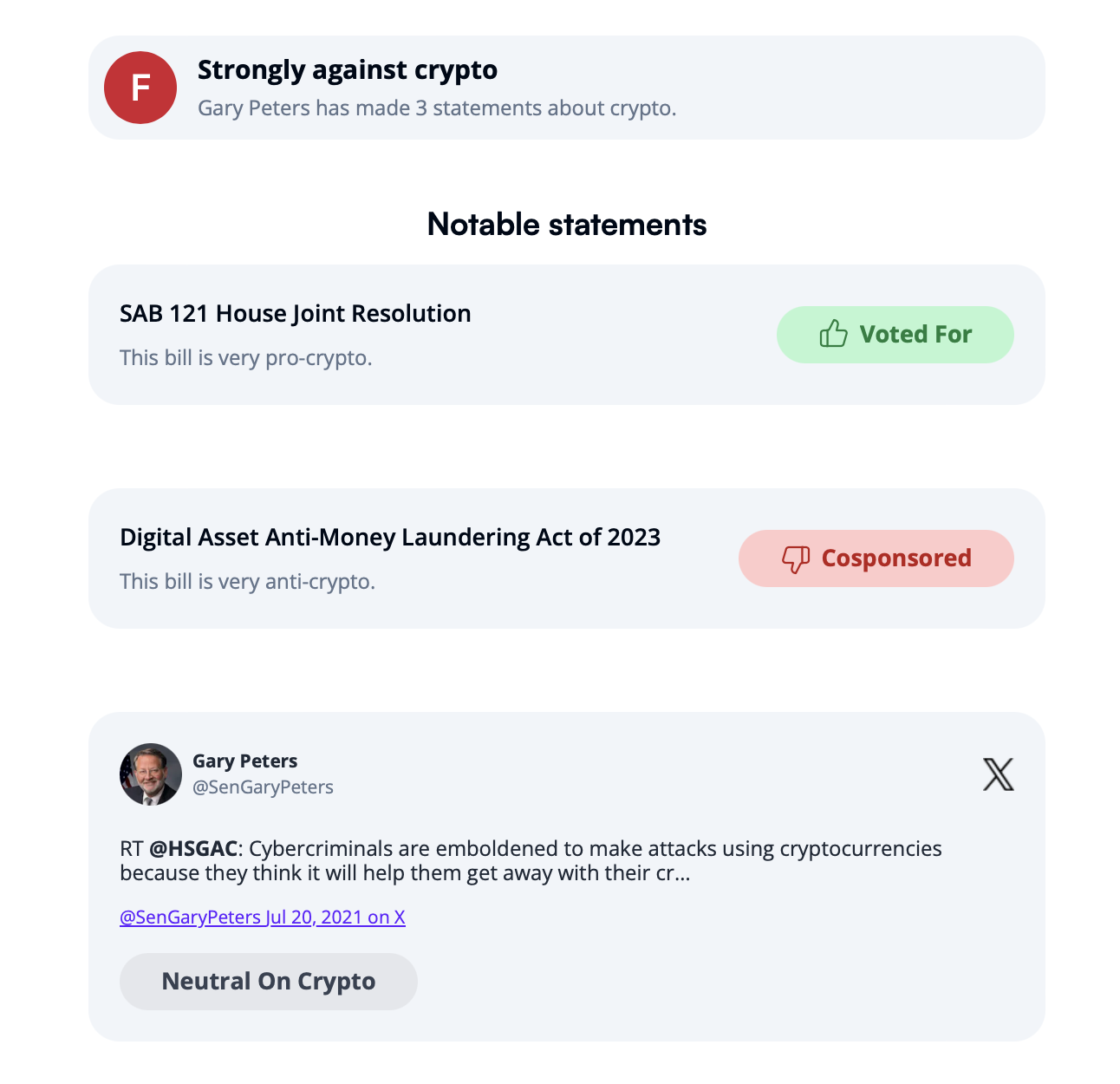 Niettemin dringen vakbonden naar verluidt aan op senator Gary Peters uit Michigan om te dienen als de vicepresidentiële kandidaat op het ticket van de Democratische Partij. Peters is een uitgesproken crypto-criticus, wat zijn “F” rating bij Stand With Crypto, een non-profitorganisatie voor digitale activa opgericht door Coinbase in 2023, verklaart.
