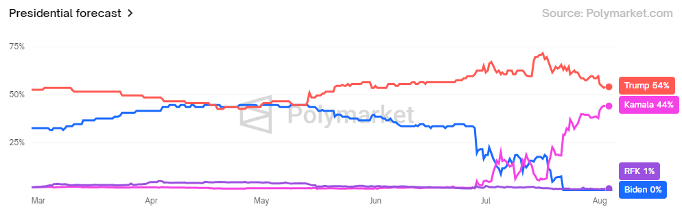 De kansen van Kamala Harris om de verkiezingen in november te winnen zijn gestegen naar 44%, een ongekend niveau voor de de facto Democratische kandidaat. Ondertussen heeft Kamala Horris (KAMA), de meme coin geïnspireerd door haar persona, het moeilijk vanwege het algemene sentiment op de cryptomarkt.