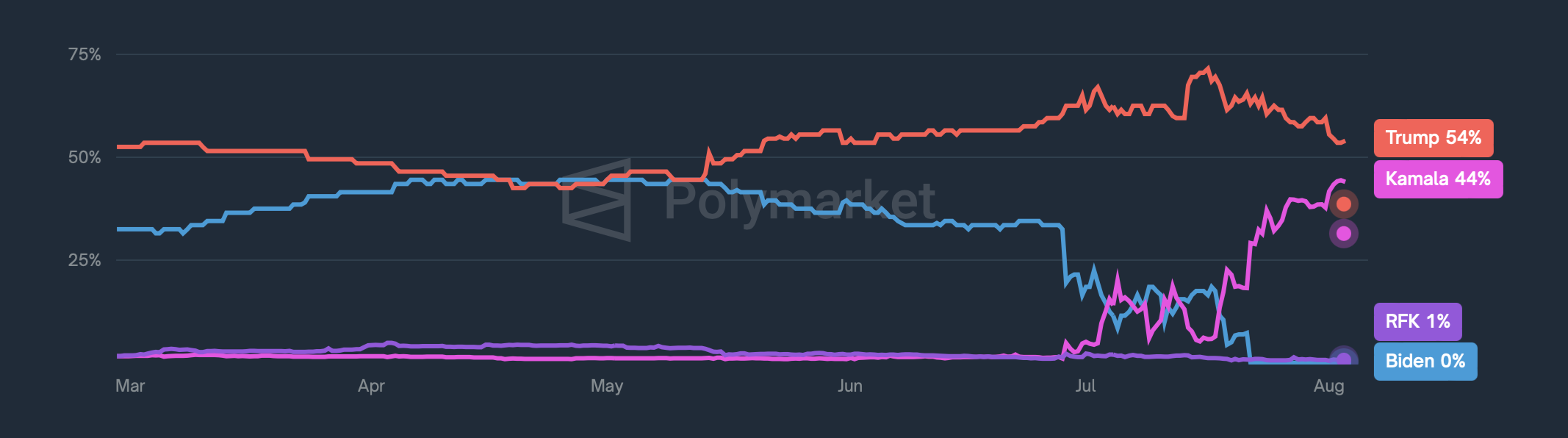 Andere oproepen omvatten dat de partij een presidentiële running mate kiest met een sterk beleid voor digitale activa. Volgens rapporten kijkt Harris al naar mogelijke kandidaten voor vicepresident. Ze is zich bewust van de implicaties die haar keuze zou hebben op haar kandidatuur in november. Ondertussen zijn haar kansen om de verkiezingen te winnen gestegen naar een all-time high van 44%.