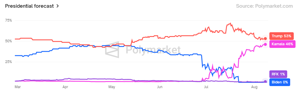 Interessant is dat de selectie Harris’s winstkansen op Polymarket niet heeft geschaad, die nu op 46% staan tegenover 53% voor Donald Trump. Het zal interessant zijn om te horen wat de Democraten op donderdag zullen zeggen.