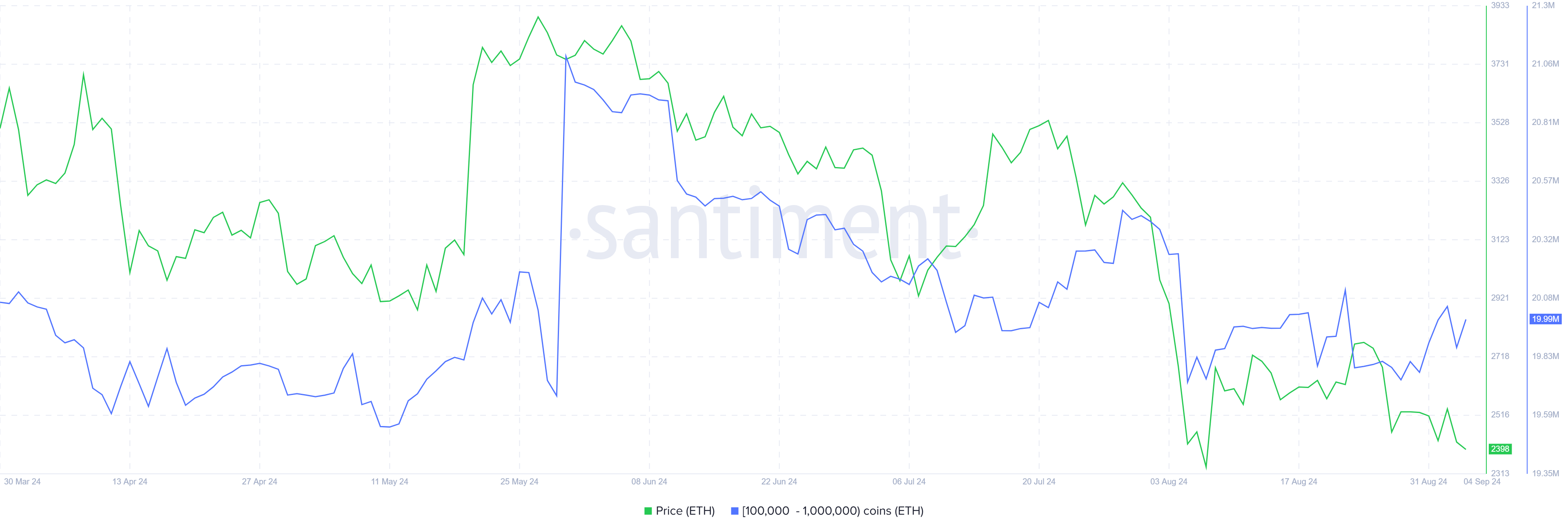Bovendien lijkt het sentiment van investeerders ten opzichte van Ethereum bearish, vooral gezien de acties van grote houders, vaak aangeduid als crypto whales. Adressen die tussen 100.000 en 1 miljoen ETH bezitten, hebben ongeveer 410.000 ETH verkocht in de laatste week, wat neerkomt op net geen $1 miljard aan waarde.