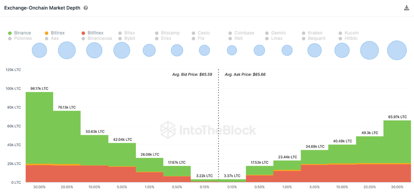 De Exchange On-chain Market Depth chart, die de prijsverdeling van de huidige actieve orders toont, bevestigt ook deze positieve vooruitzichten. Zoals hieronder te zien is, is de marktvraag naar Litecoin nu groter dan het aanbod.