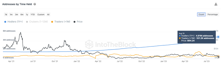 Terwijl de prijs zakte naar het dieptepunt van $56 in 2023, hebben langetermijnhouders van Litecoin opnieuw veerkracht getoond in plaats van het schip te verlaten. Zoals je hierboven kunt zien, is het aantal langetermijnhouders tussen 17 en 21 augustus al met 10.000 adressen gestegen. Tijdens die periode veerde de prijs van LTC met 16% op van de flash crash op 17 augustus.