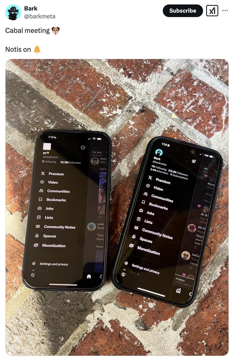 Als toevoeging aan de verdenking begon Ye’s officiële X-account een van Barkmeta’s teamleden te volgen, bekend als Tall—een figuur die volgens Blade een alternatieve Barkmeta-account is.