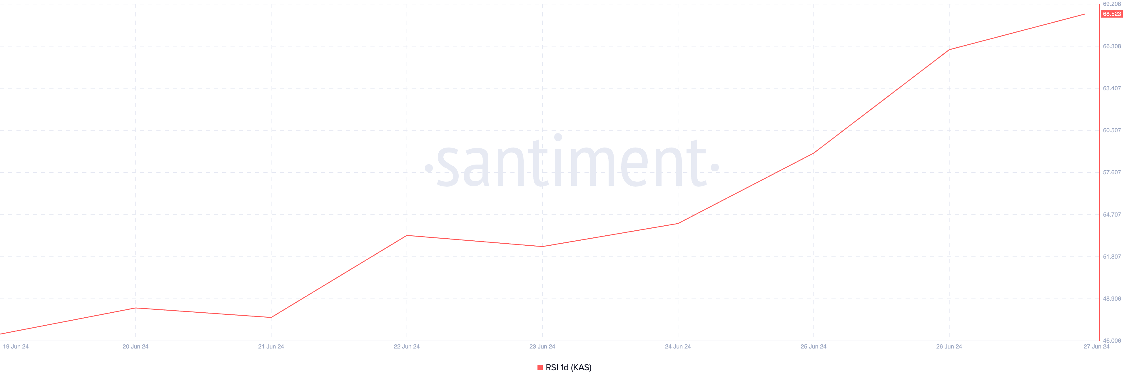 Op 68,52 duidt de RSI van KAS op hoge verkoopdruk onder marktdeelnemers. Dit bevestigt dat de stijging van de koers van de token wordt ondersteund door een daadwerkelijke vraag, die nodig kan zijn om de rally te ondersteunen.