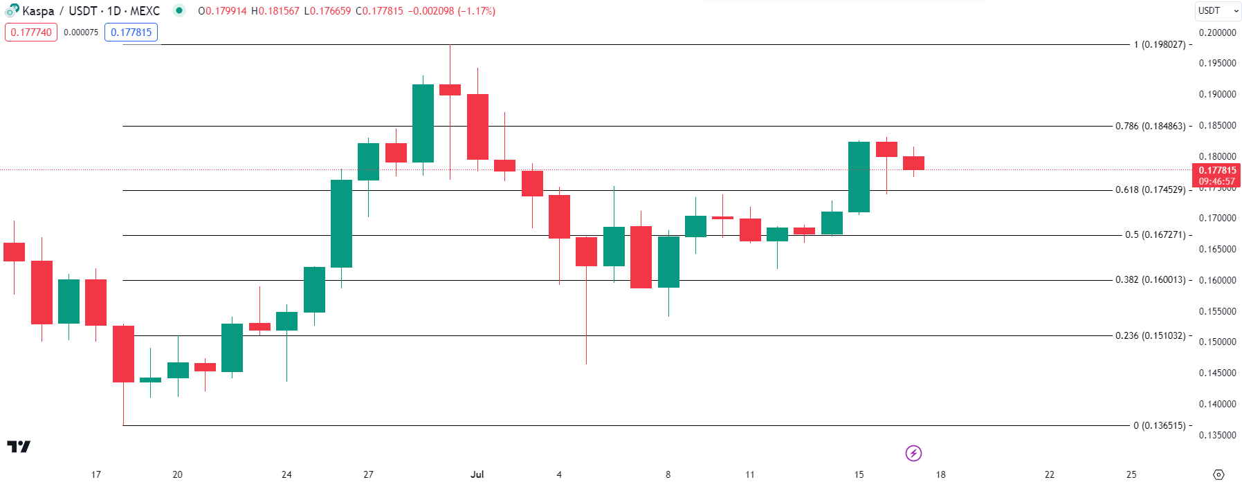 KAS begon binnen dit kanaal te trenden op 4 juli en de koers is sindsdien met 6% gestegen. Op het moment van schrijven noteert de 25e grootste cryptocurrency $0,18.