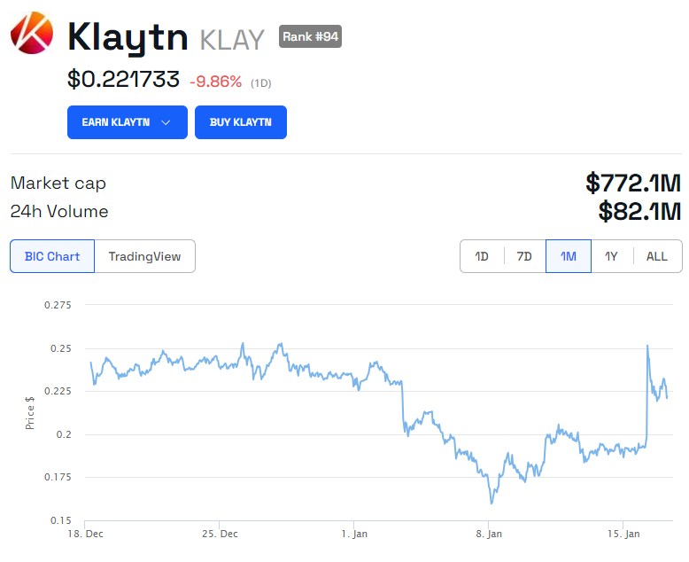 Klaytn’s KLAY token wordt verhandeld voor $0,222 op het moment van schrijven. Het heeft genoten van een mooie winst van 25% deze week, maar is nog steeds meer dan 94% gedaald vanaf de all-time high van $ 4,24 in 2021.