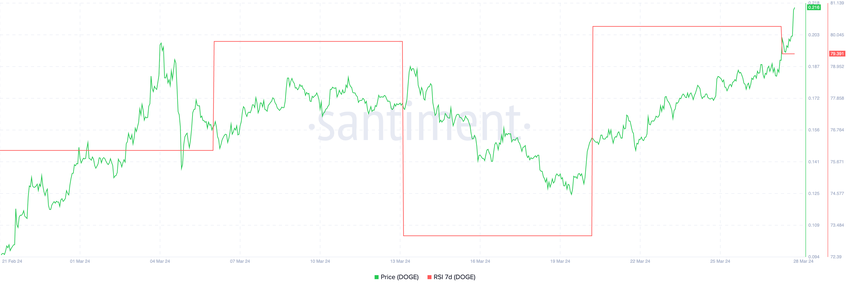 Zelfs na de recente opwaartse reis van de koers van DOGE, onthult de lichte daling van de Relative Strength Index (RSI) van 80 naar 79, ondanks dat het boven de typische overbought drempel van 70 blijft, een bullish verhaal.