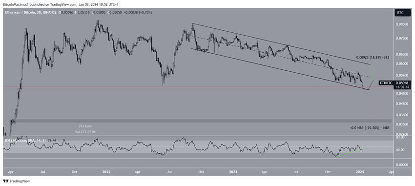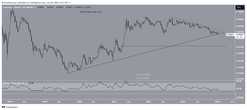 De Ethereum/Bitcoin (ETH/BTC) grafiek laat zien dat de ETH koers sinds september 2022 onder een dalende weerstandstrendlijn (stippellijn) is gezakt. De neerwaartse beweging leidde tot een low van ₿0,049 in december 2023.