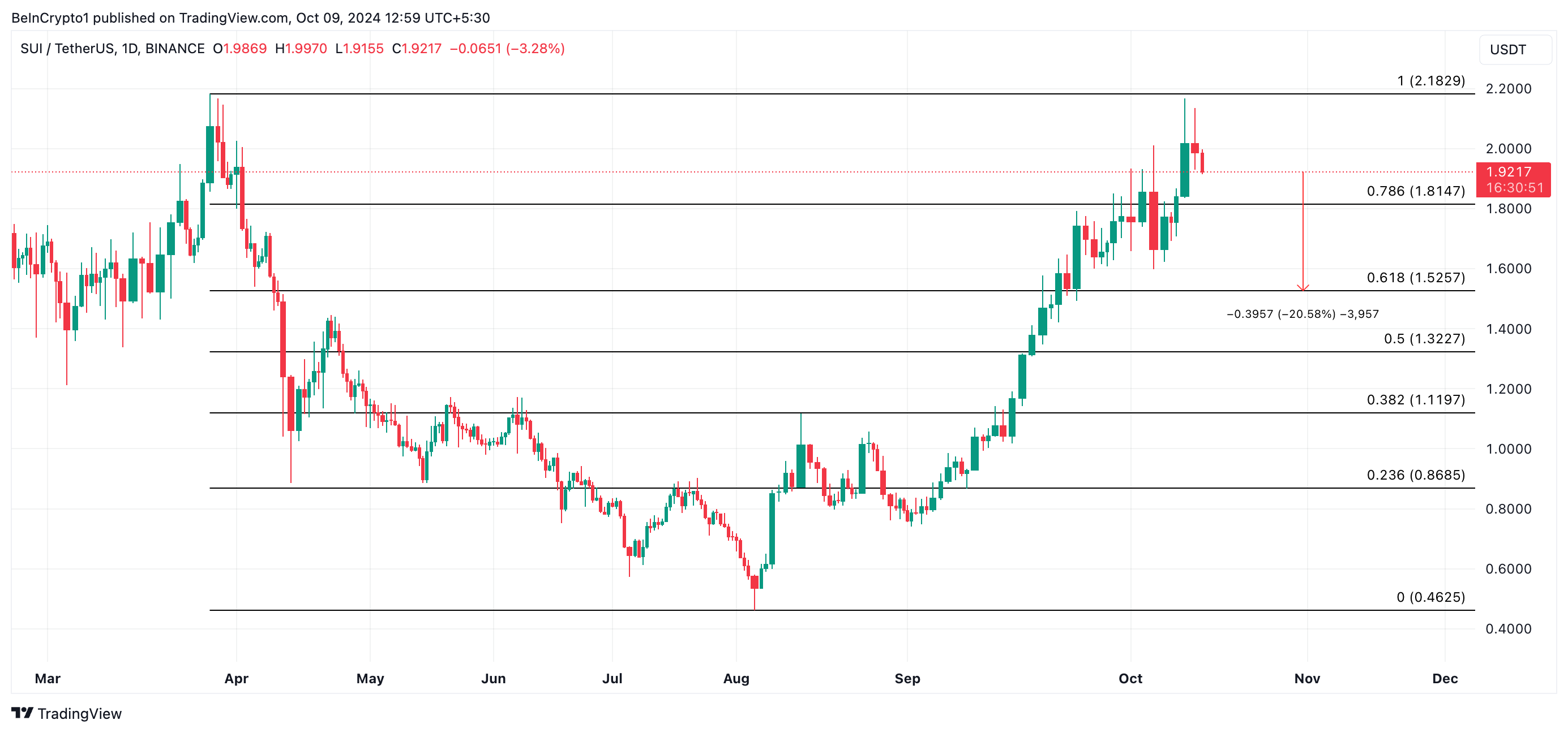 SUI heeft een toename gezien in de vraag naar shortposities sinds begin oktober, zoals blijkt uit de negatieve funding rate van -0,0012% op het moment van schrijven.