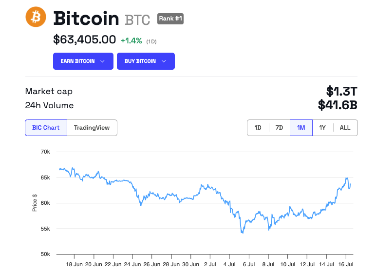 Deze ontwikkeling heeft invloed gehad op de koers van Bitcoin. Eerder vandaag bereikte Bitcoin kort $65.000 voordat het terugviel naar $63.405 op het moment van schrijven. Ondanks de terugval is BTC nog steeds met 1,4% gestegen in de afgelopen 24 uur.