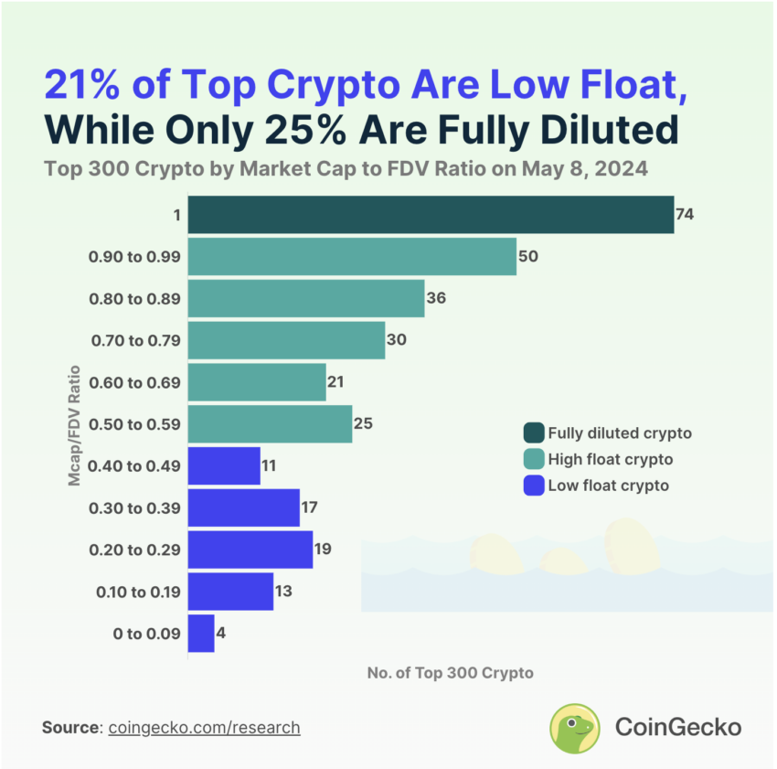 “Voor het doel van deze studie werd low float crypto gedefinieerd als een market cap tot FDV-ratio van 0 tot 0,49, high float crypto had ratio’s van 0,50 tot 0,99, en alleen crypto’s met een ratio van 1 werden beschouwd als volledig verwaterd,” legde CoinGecko uit.