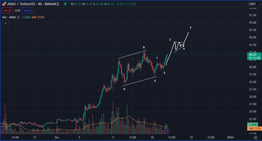 De meest waarschijnlijke telling suggereert dat AVAX zich in de vijfde en laatste wave bevindt van een opwaartse beweging. Deze beweging begon in september.