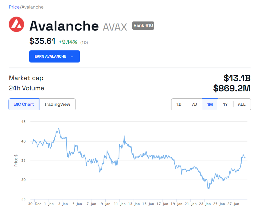 Avalanche’s AVAX token weerspiegelt de opwinding rond deze ontwikkelingen. Volgens de data van BeInCrypto is de koers van AVAX met ongeveer 10% gestegen tot bijna $36 bij het ter perse gaan.