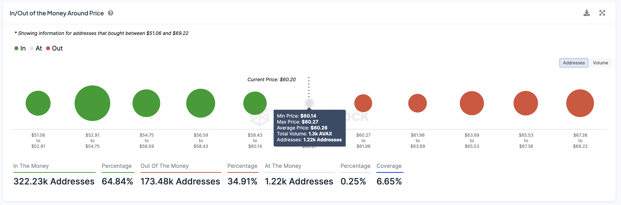 In the Money adressen zijn adressen die AVAX kochten tegen een koers die lager is dan de huidige koers, wat impliceert dat ze zich momenteel in een winstgevende positie bevinden. Out-of-the-Money adressen kochten tegen een hoge koers en staan momenteel op verlies.