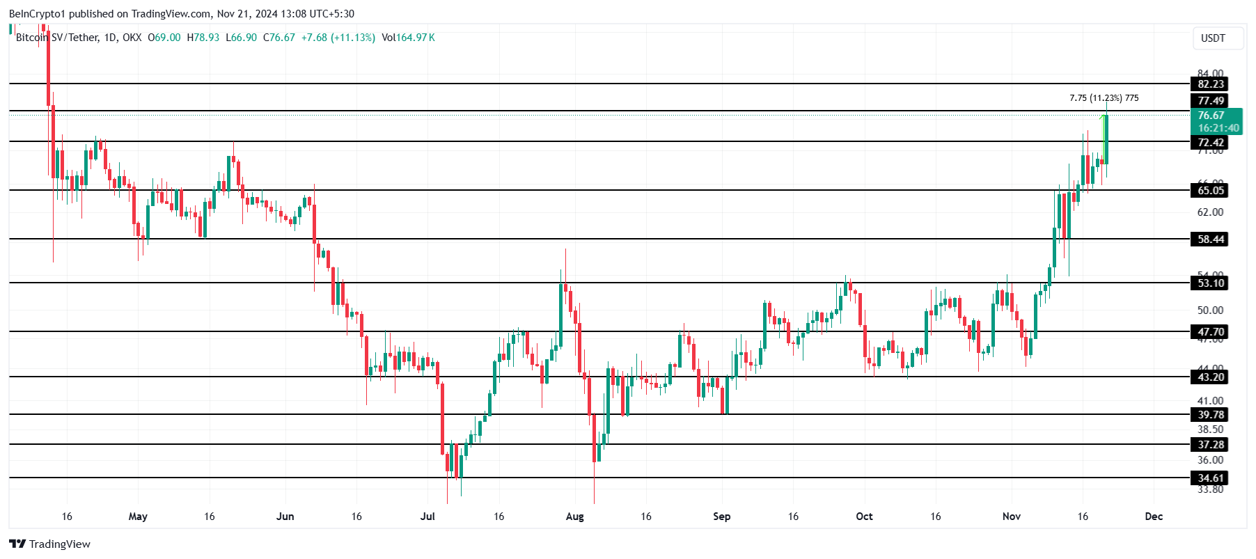 Bitcoin SV steeg met 11% in de afgelopen 24 uur en bereikte een 7-maandse high van $76,67. De rally van de altcoin heeft de interesse van investeerders opnieuw aangewakkerd, aangezien het de winsten van de cryptomarkt van vandaag leidt.