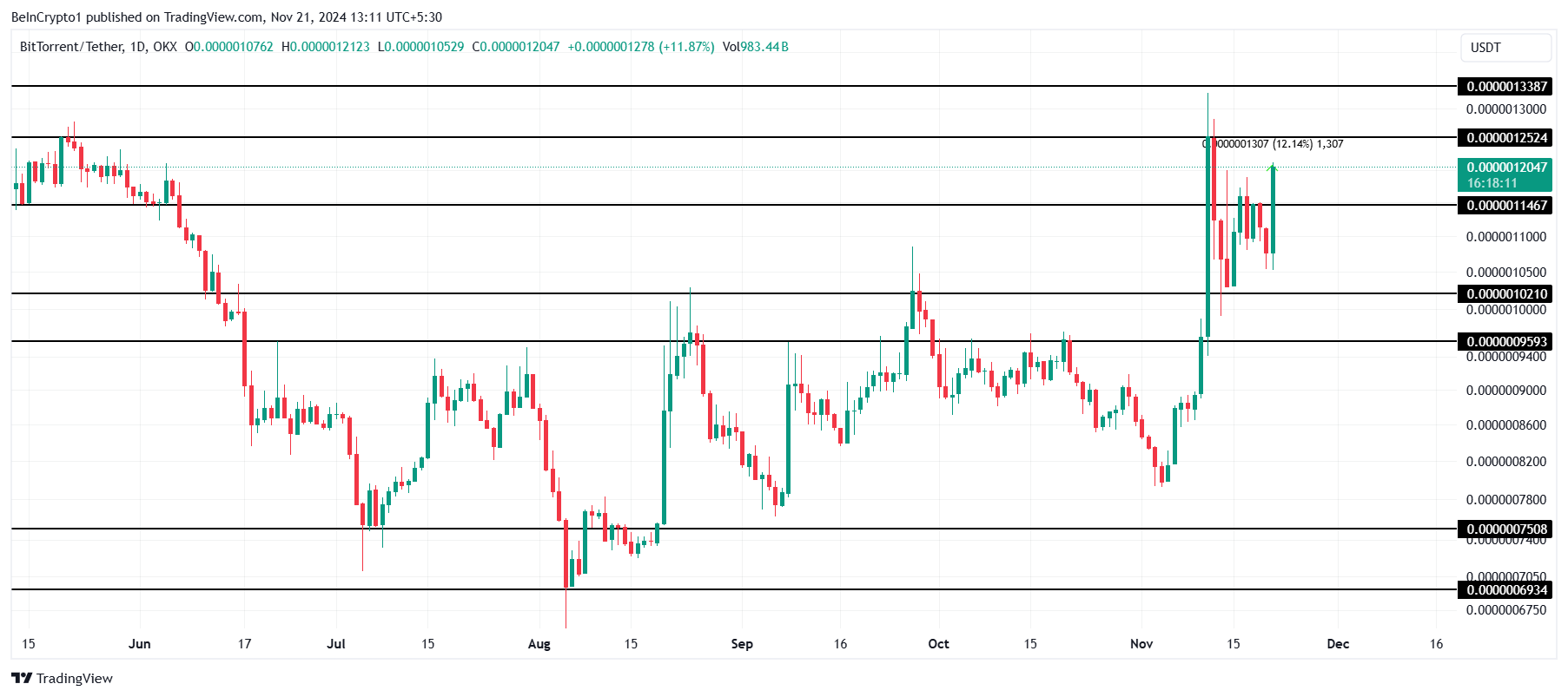 De vroege november rally van BTT kwam bijna door de weerstand op $0,000001252. Echter, het falen veroorzaakte correcties. Het succesvol doorbreken van deze barrière is cruciaal voor de altcoin om boven $0,000001300 te sluiten en zijn opwaartse momentum op korte termijn te behouden.
