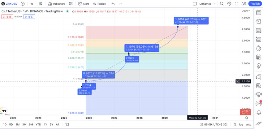 Als hetzelfde pad aanhoudt, zou ZRX zelfs zijn all-time high koersniveau van $ 2,53 kunnen doorbreken tegen medio 2027. Als we hetzelfde pad vervolgen, zou ZRX tegen het einde van 2029 $4,135 kunnen bereiken.
