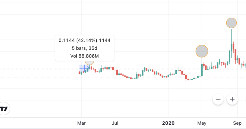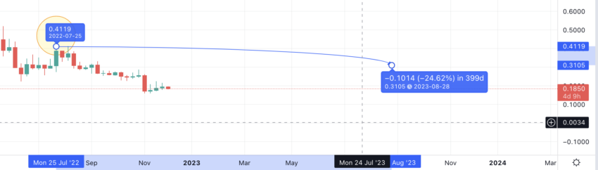 Volgens het patroon zou de volgende high dus 399 dagen vanaf de laatste high (25 juli 2022) moeten zijn. Het zou ook 24% lager moeten zijn dan $ 0,4293.
