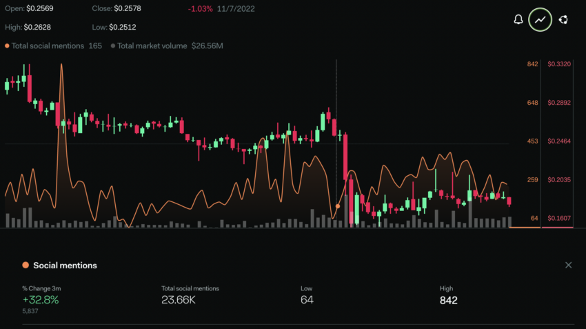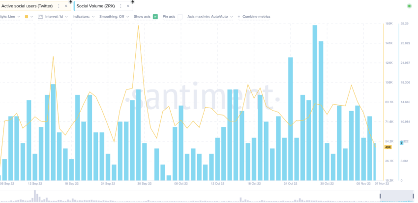 De social activiteit van ZRX is stabiel. De koers daalde echter begin november 2022 ondanks behoorlijke handelsvolumes.