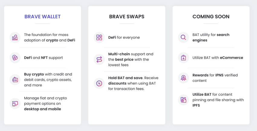 - Het BAT-ecosysteem omvat nu de Brave Wallet en Brave Swaps voor DeFi-blootstelling. Het zou binnenkort plaats kunnen maken voor eCommerce gebruik.