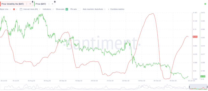 Prijsvolatiliteit kan schadelijk zijn voor de koers van digitale assets. De BAT koers dook elke keer als de volatiliteit piekte – medio november 2022 is bewijsstuk A. Dit betekent dat de koers van BAT tokens op korte termijn zou kunnen corrigeren, op voorwaarde dat er high volatiliteit is.