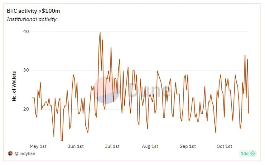 De grafiek hieronder geeft een overzicht van het aantal Bitcoin-transacties dat eind 2023 de 100 miljoen dollar per dag overschreed. Deze transacties worden meestal verondersteld toe te behoren aan institutionele investeerders, omdat particuliere investeerders zelden de mogelijkheid hebben om grote hoeveelheden kapitaal in te zetten.