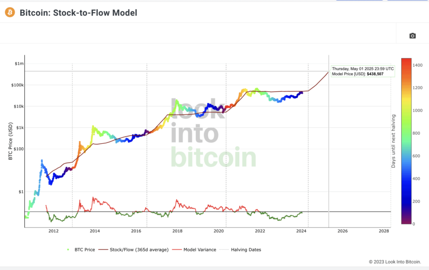 Een van de belangrijkste fundamentele statistieken is het stock-to-flow model. Begin 2024 begon de S2F-ratio te stijgen, terwijl de Bitcoin-koers de fair value benaderde die door het model werd voorspeld. Dit suggereerde dat de koers tijdelijk zijwaarts kon bewegen en de S2F-ratio zou volgen, voordat een stijging richting het $100K-niveau plaatsvond.
