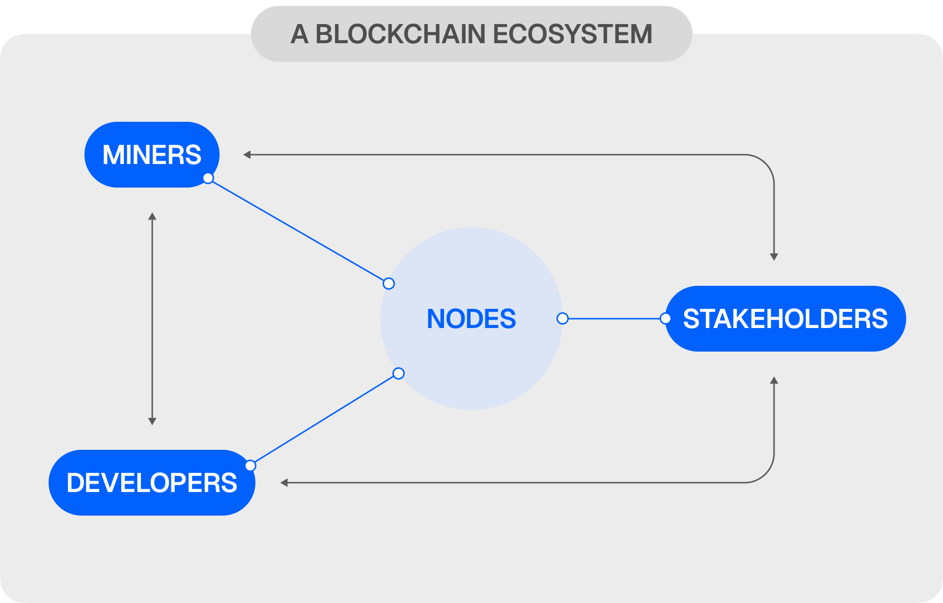 Een blockchain ecosysteem bestaat uit verschillende belangrijke componenten die samenwerken om het netwerk in stand te houden: