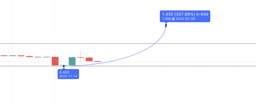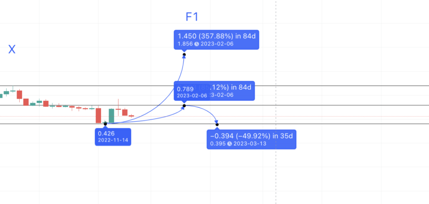 Als de high voor 2023 dus $0,782 is, kan de low ergens in de buurt van $0,403 liggen. Als de high volgens de projectie op $1,856 komt, zou de low op $0,97 liggen.