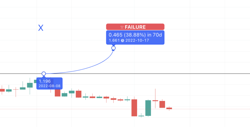Als we de eerste high van het volgende patroon op X beschouwen, op 8 aug. 2022, dan zou het volgende punt Y een stijging van 39% kunnen laten zien, 67 dagen vanaf X.
